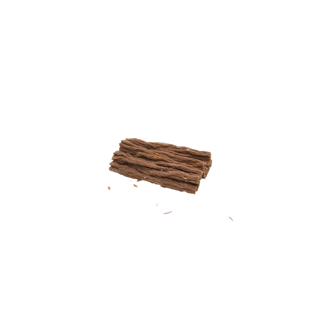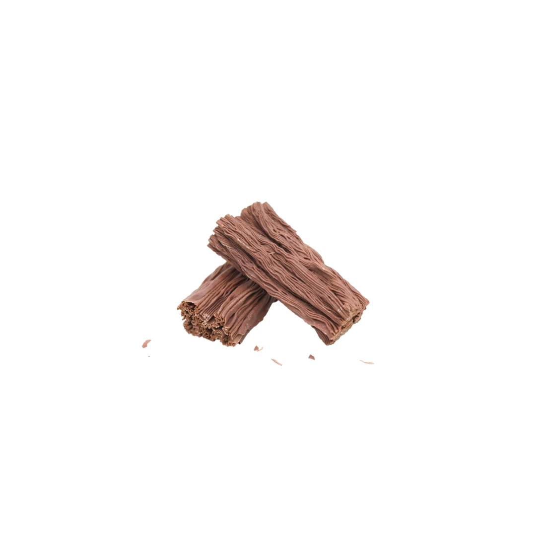 Finísimas capas de chocolate de leche hechas a mano imitando el tronco de un árbol.