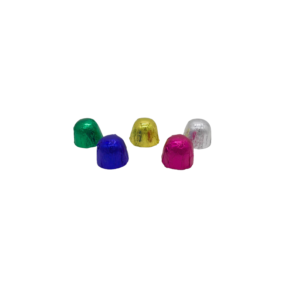 Caja de bombones rellenos de licor artesanales diferente según el color: gin tonic (plateado), whisky (amarillo), ron (azul), kirsch (verde) y coñac (fucsia).