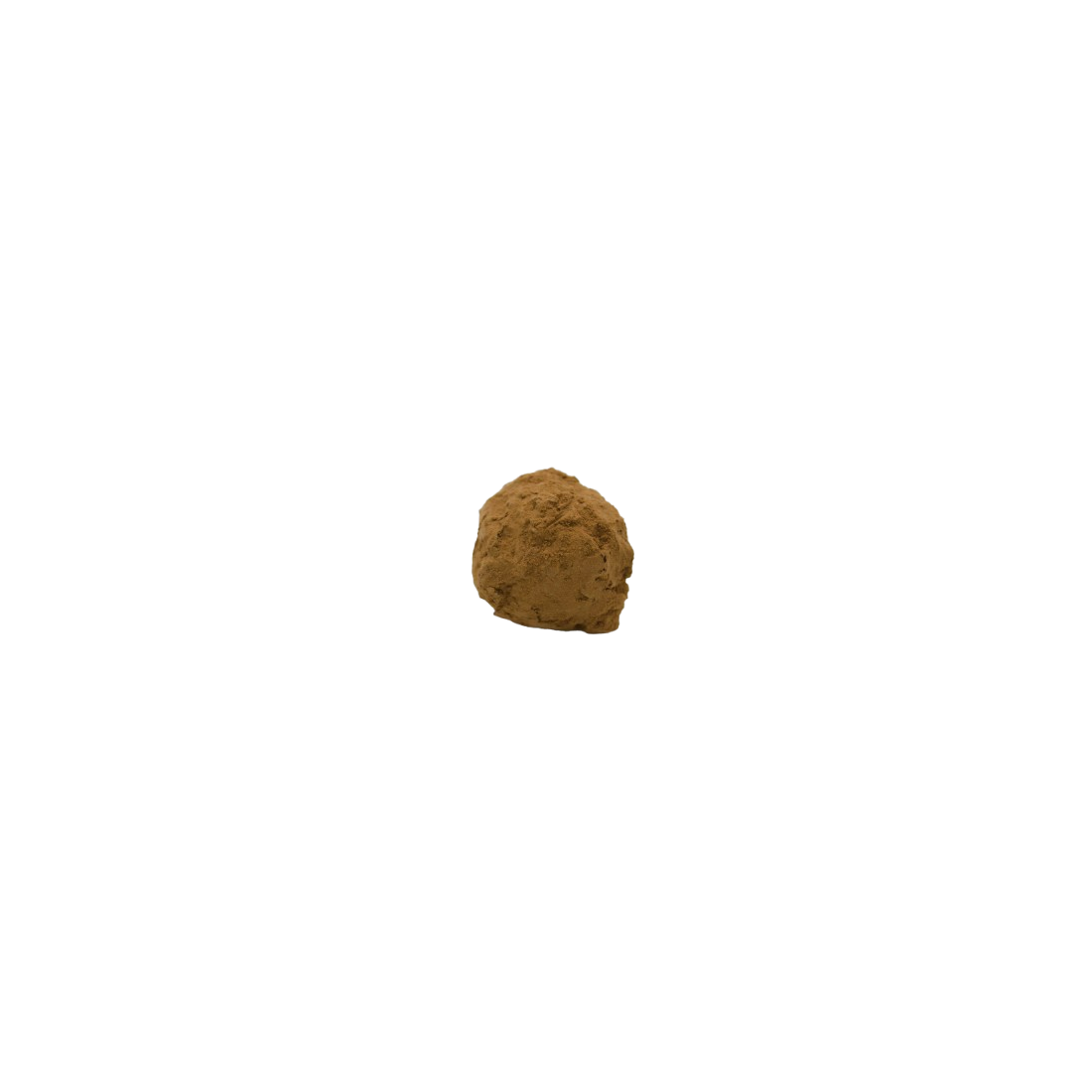 Trufa con suave relleno de chocolate negro con esencia de cognac, bañada a mano con tenedor y exterior de polvo de cacao natural.